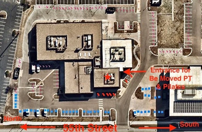 We are located on the first floor, inside the Be Moved PT suite. After you turn in, drive forward and park on either side or behind the building in any of the parking spaces marked in pink or red in the photo.